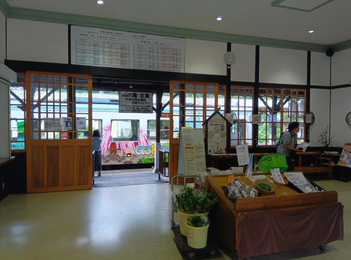 12時16分に、郡上八幡駅に到着しました! 1929年開業当時の外観の姿に復元した駅舎、木のぬくもりと安らぎをあふれる待合室、窓ガラス越しのきっぷ売り場、旅人にやさしい駅係員さんが立つ改札口。昭和世代には、どこか懐かしい光景です。