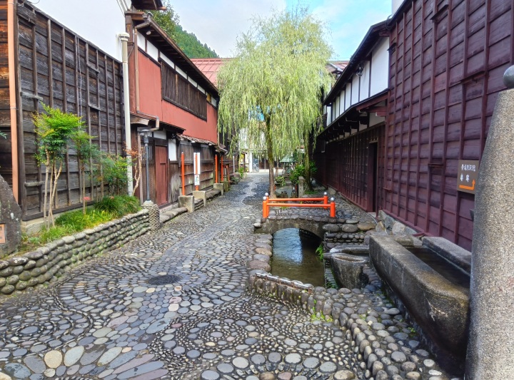 昨日、まちなみ観光案内人にガイドいただいたので、本日は、余裕をもって街歩きを楽しめます。街中にある新町通りを歩いていると、「やなか水のこみち」が見えてきました。郡上八幡のシンボル的なスポットで、玉石を敷き詰めた道と、その脇を流れる水路、柳の木立により風情あるひとときを過ごすことができます。