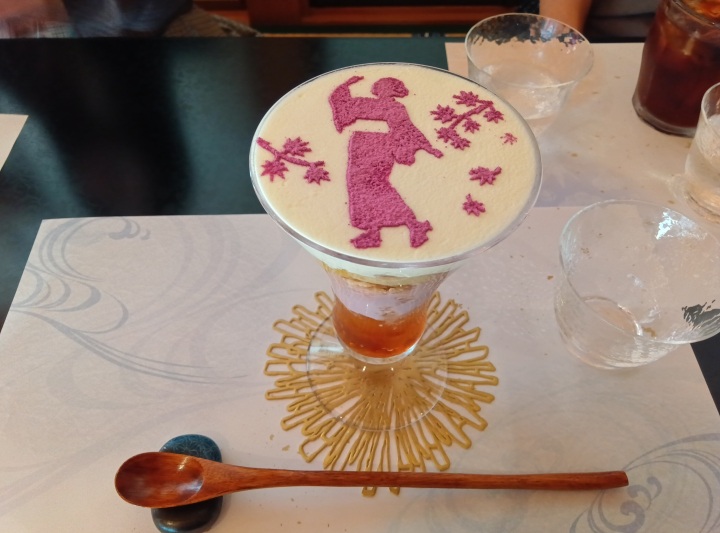 この宗祇水のすぐそばに、郡上おどりのポーズをあしらったパフェで有名なお抹茶処があります。秋には「栗パフェ」のメニューがありますよ!