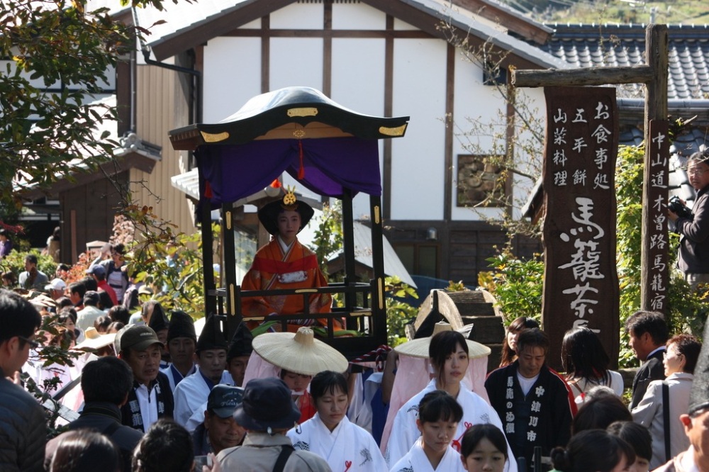 毎年2月~3月にかけて、御嶽宿・伏見宿のお家や商店の軒先には、ひな人形が飾られ、町全体がひな祭りの雰囲気に包まれます。ひな人形やひな菓子作りの体験も可能。「美江寺宿場まつり」(春開催)や「馬籠宿場まつり」(秋開催)は宿場町の季節を彩る華やかなイベントとなっています。