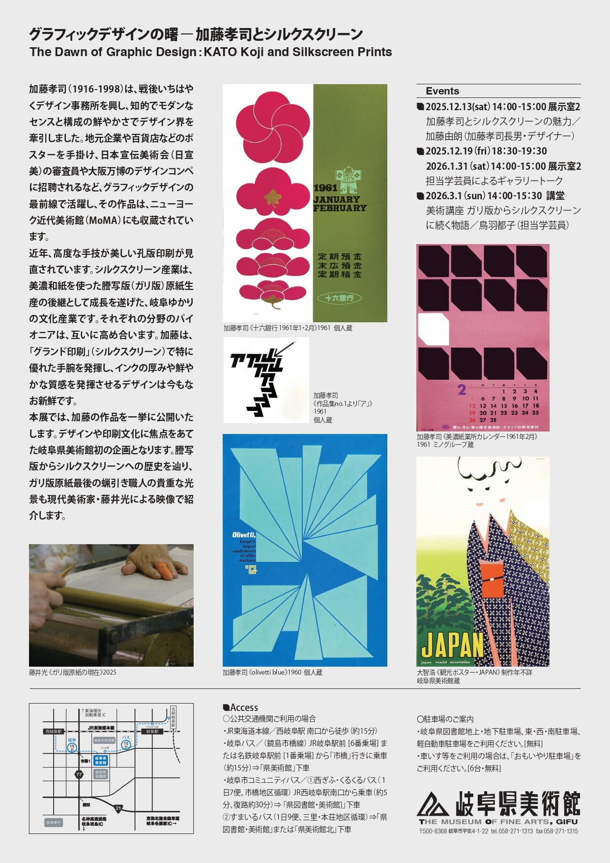 加藤孝司(岐阜市生)は洒脱でモダンなセンスで全国的に活躍しました。シャープで質感に優れ、高度な手作業の気配が美しい孔版印刷の作品及び美濃紙業所(現ミノグループ)秘蔵のカレンダーコレクションを一挙に公開いたします。また、戦後、政治経済活動や文化発信が東京に一極集中していくなか、あえて岐阜に軸足をおいた加藤と、岐阜の文化産業史にも目を向け、加藤とシルクスクリーンを起点に、それが生み出された背景についても紹介します。デザインや印刷文化に焦点をあてた岐阜県美術館初の企画となります。
