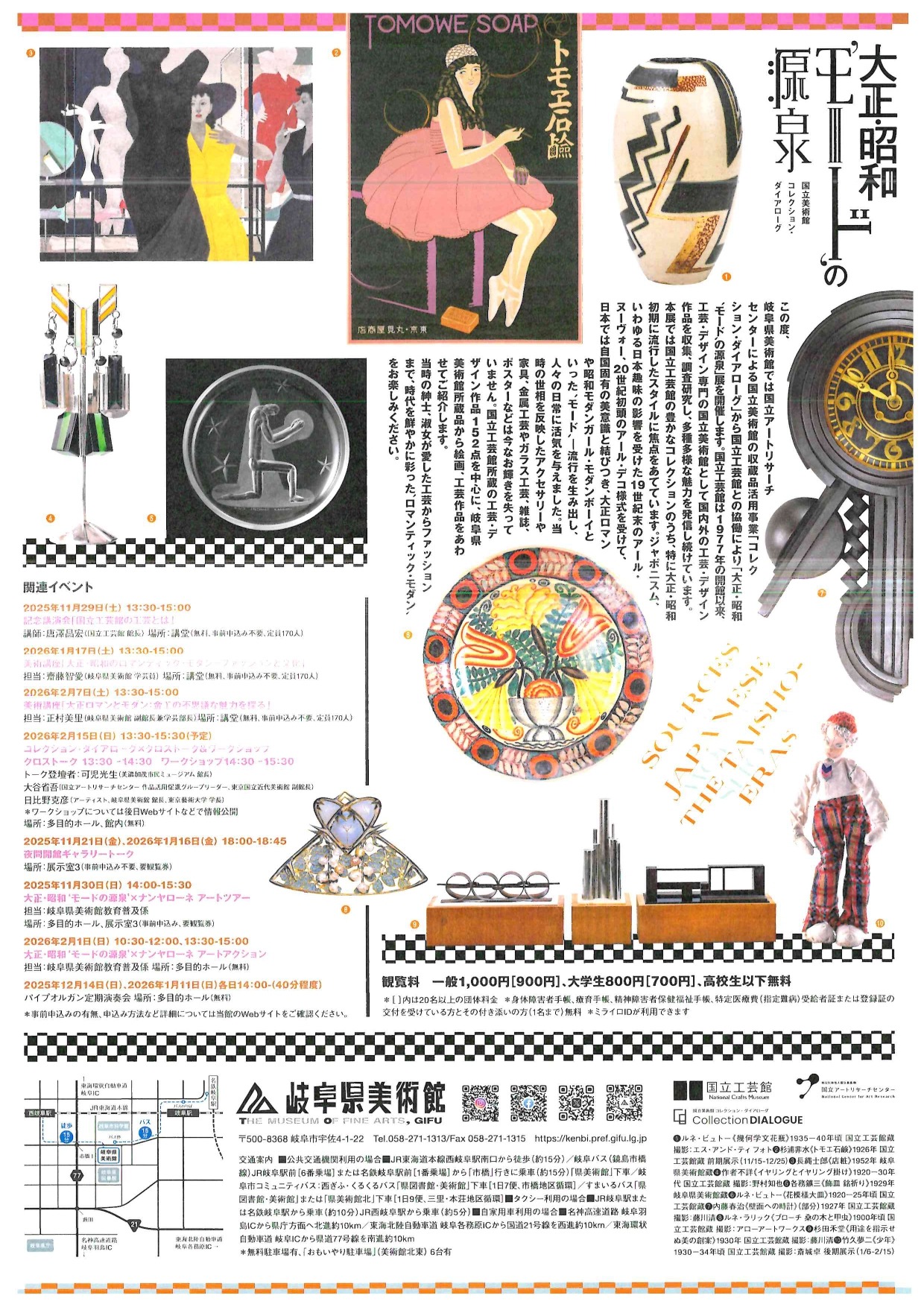 国立工芸館のコレクションのうち、特に大正から昭和初期に流行したスタイルに焦点を当てた展覧会です。ジュエリーや家具、グラフィックデザイン作品152点を中心に、岐阜県美術館所蔵の絵画や工芸作品と併せて紹介しています。