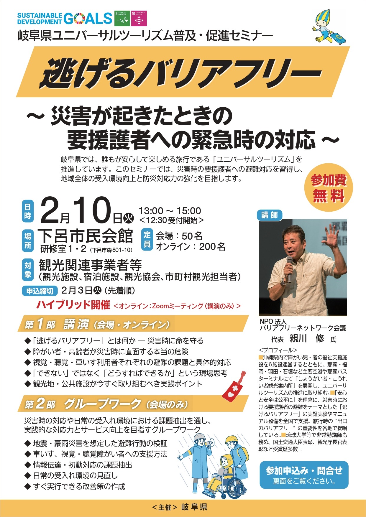 岐阜県ユニバーサルツーリズム普及・促進セミナー「逃げるバリアフリー ~災害が起きたときの要援護者への緊急時の対応~」を開催します(参加者募集)
