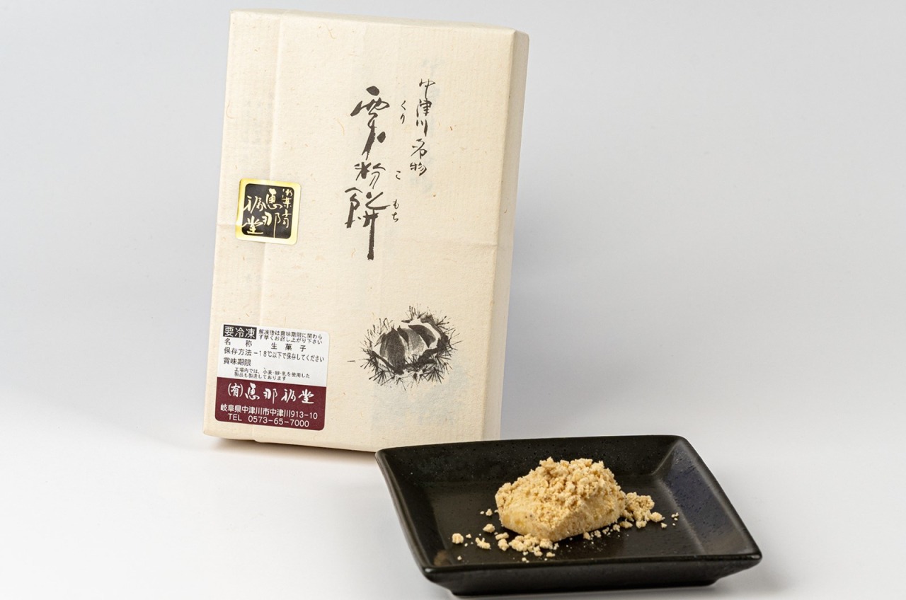 国産100%の餅米で搗き上げたお餅にそぼろ状にした栗きんとんをたっぷりとまぶしました。ぼど良い甘さと、のどごしの良さで人気です。