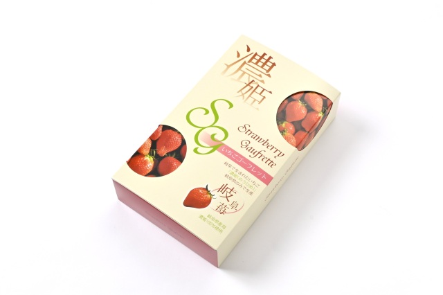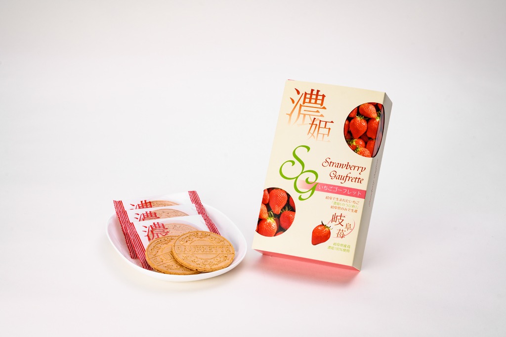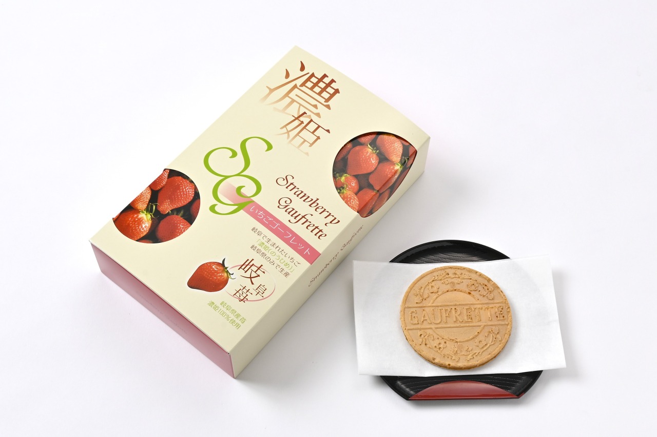 ゴーフレット生地とクリームに岐阜県産のブランドいちご「濃姫」を使用。贅沢にいちごの味と香りをお楽しみください。