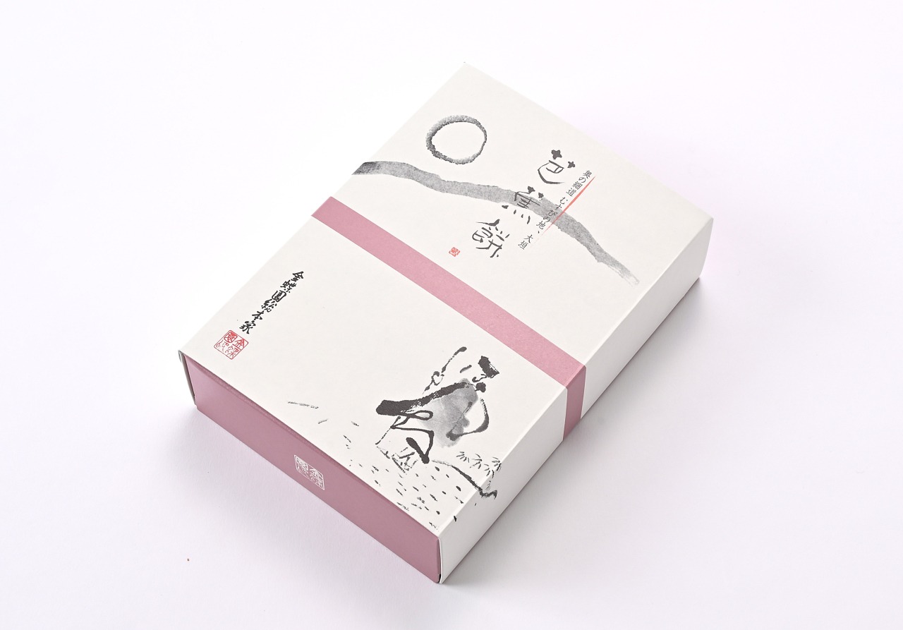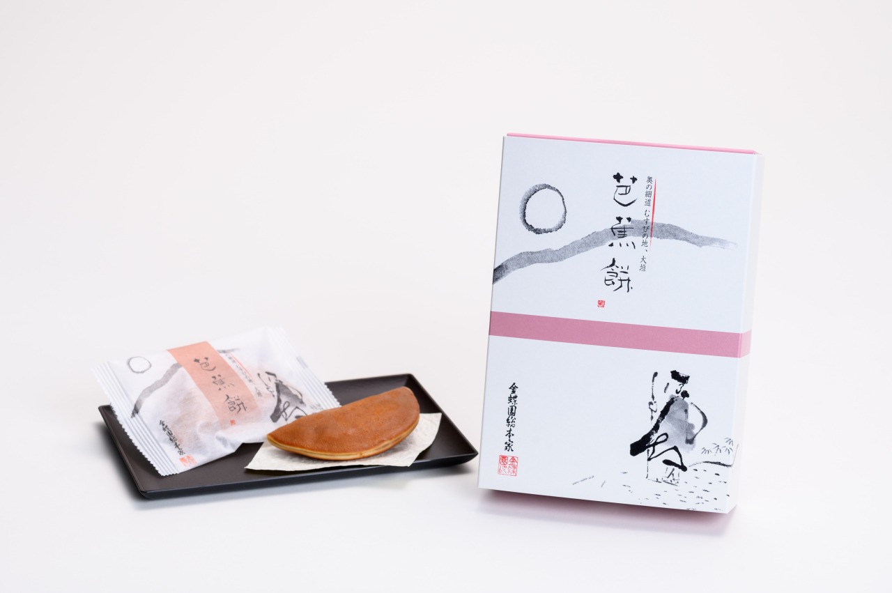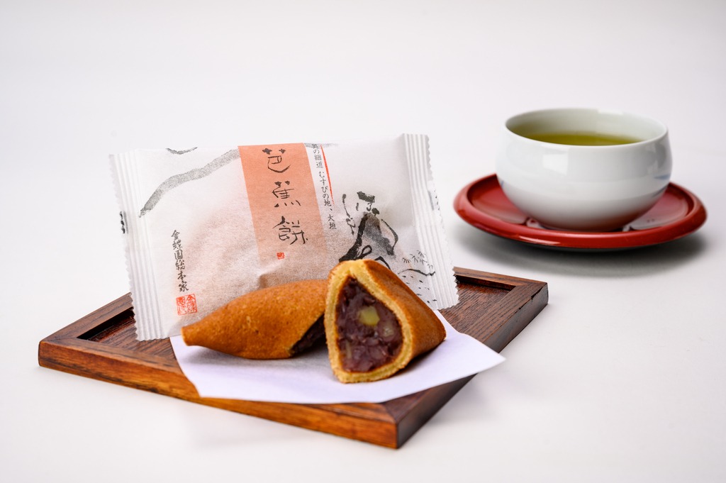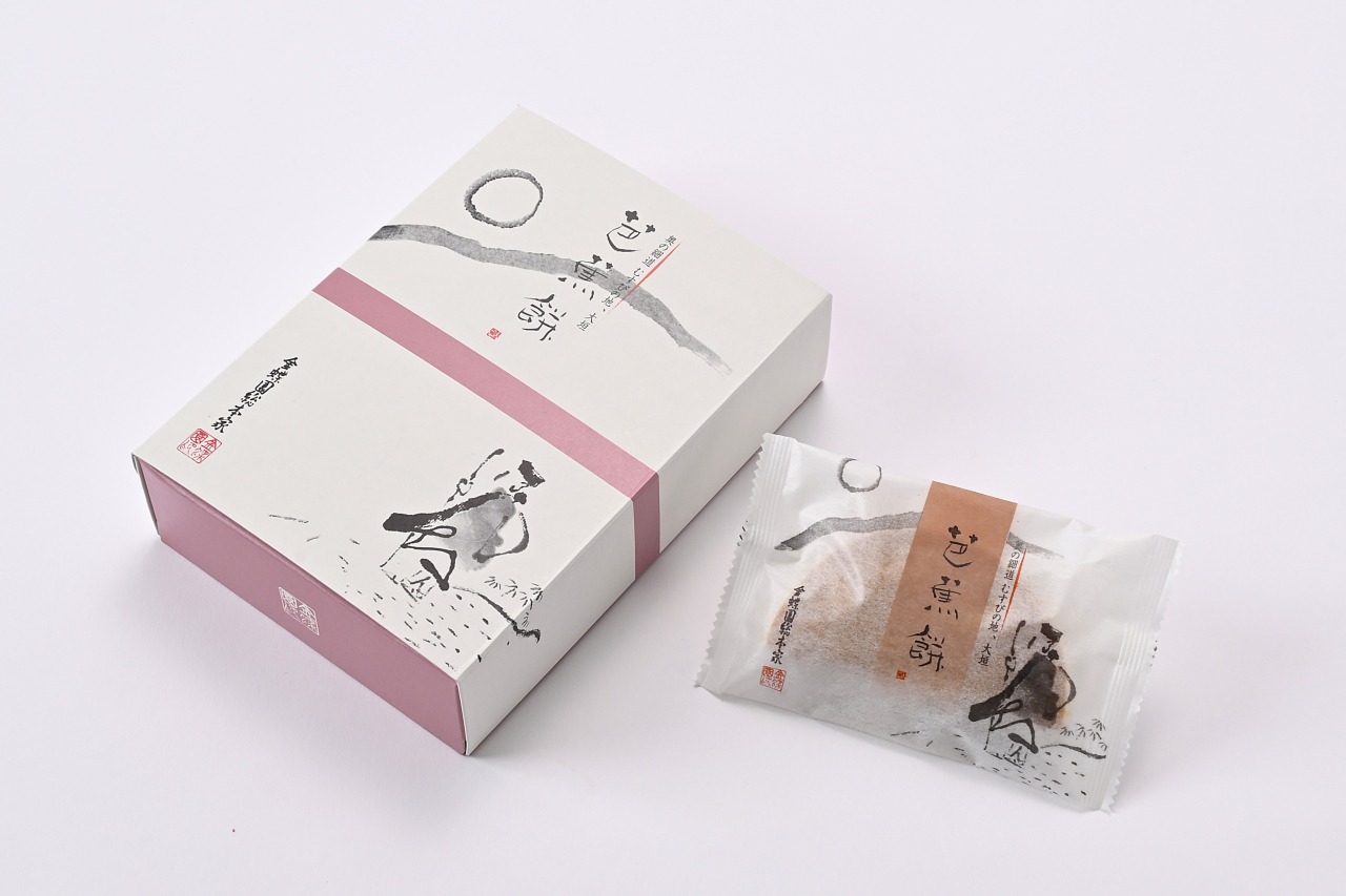 奥の細道むすびの地に因み、編笠を表しました。生地にお餅を練り込んで焼き上げ、栗入り粒餡を挟んだモチモチ食感の焼菓子です。