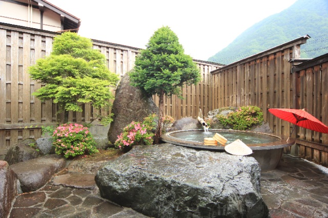 24時間入浴可能の2つの内湯と3つの露天風呂は、これら5つあるお風呂のうち空いているお好きなお風呂を無料貸切でご利用でき、プライベートで天然温泉を存分に楽しんでいただけます。
