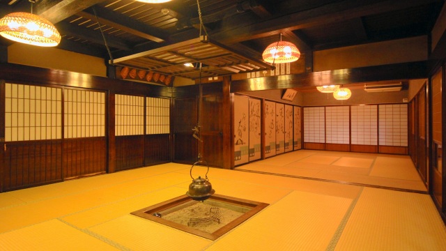 築150年の飛騨民家の雰囲気がそのまま残る館内。囲炉裏部屋から続く広間の梁の太さや建具の色合いに、奥飛騨の民家の美しさが集約されています。