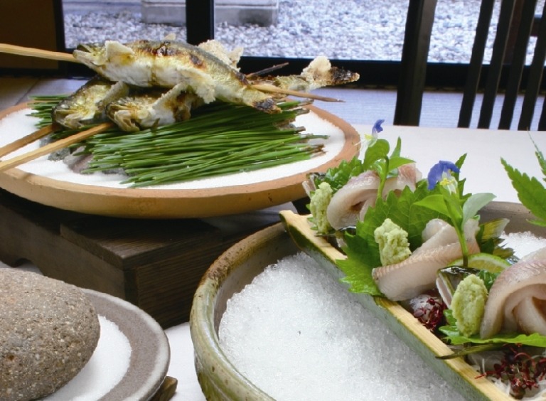 宿自慢の「香魚」とも呼ばれる甘い香りを醸し出す天然鮎をふんだんに取り入れた「鮎づくしコース」は、必食の価値があります。