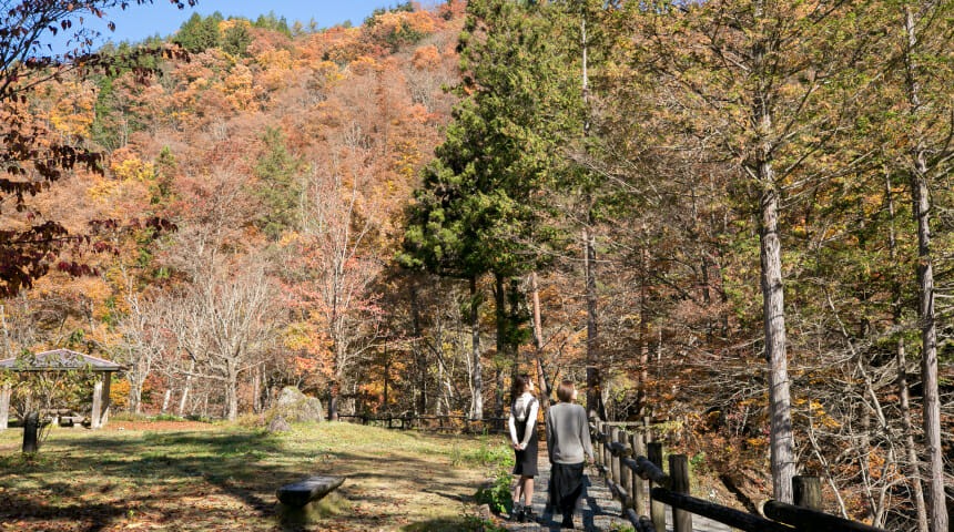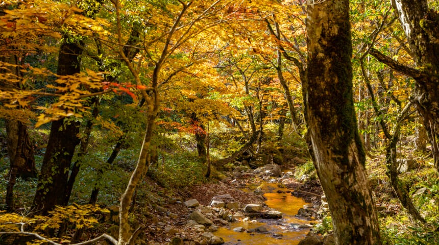 広葉樹が多く、標高差があるので一番標高の高い西ウレ峠から順番に紅葉し、長い期間にわたって紅葉が楽しめます。