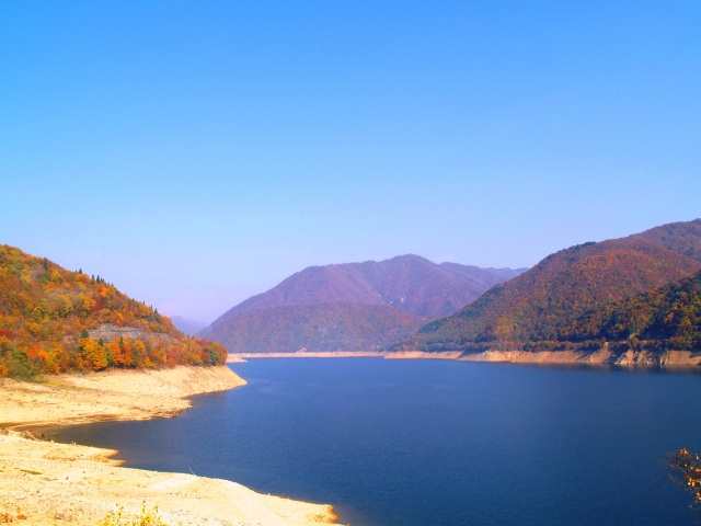 飛騨・美濃紅葉33選にも選ばれ、エメラルドグリーンの湖面と紅葉のコントラストが鮮やかです。