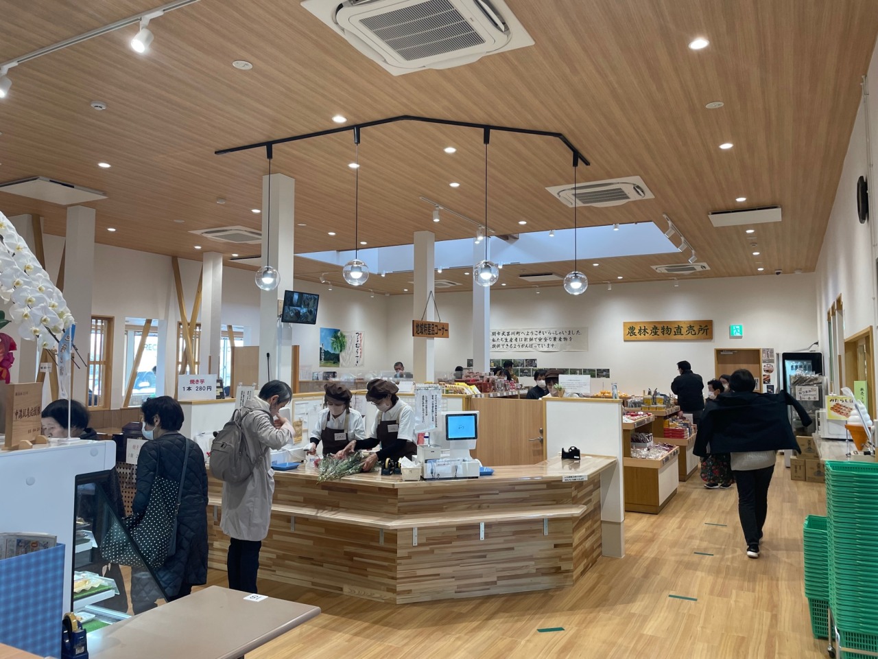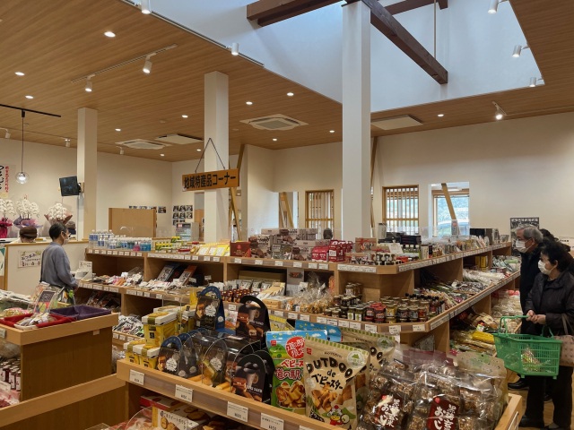 直売所には、奥美濃古地鶏やつるむらさきうどんなど、地域ならではの品々がずらり。