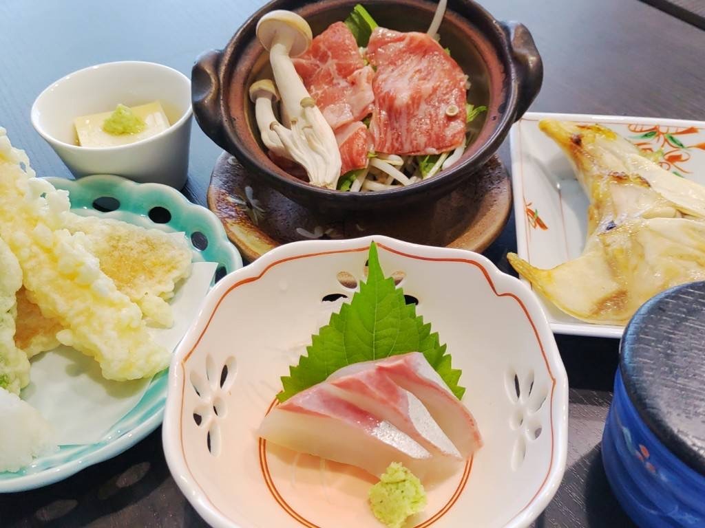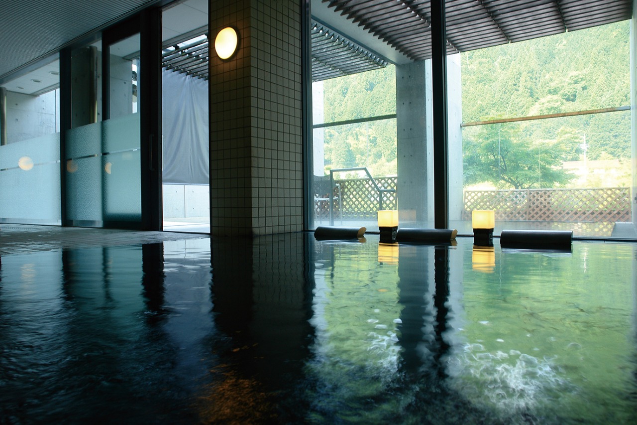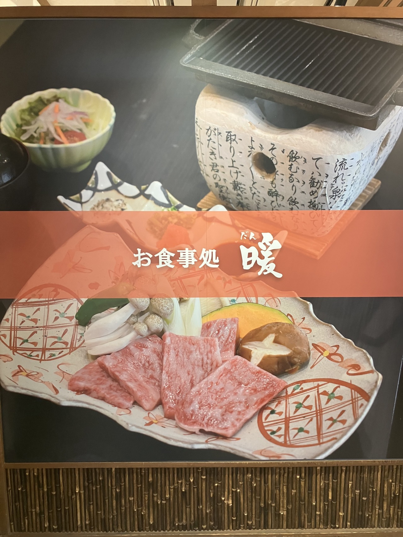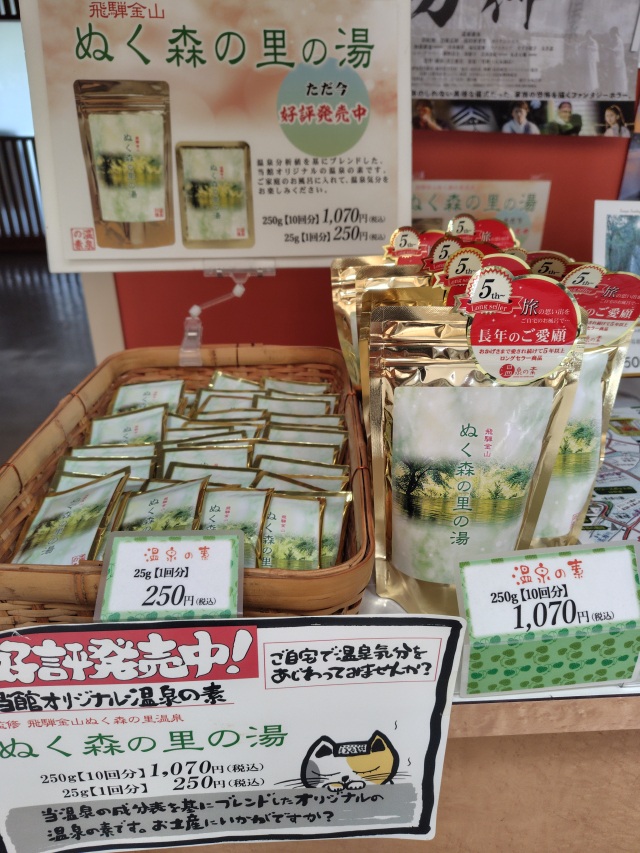 季節の食材が味わえる「暖定食」や、飛騨牛を使った定食も目玉メニューのひとつ。施設内の温泉の成分を分析して作った「ぬく森の里の湯」の販売も。