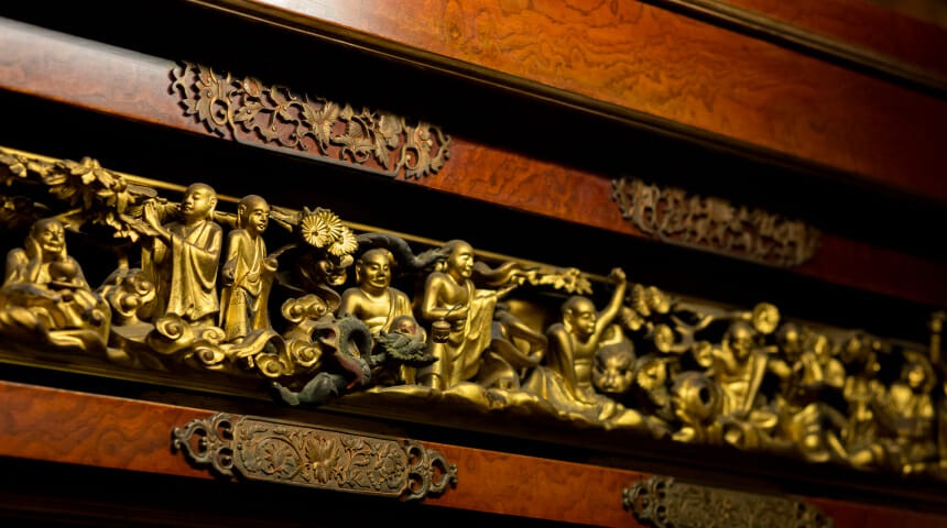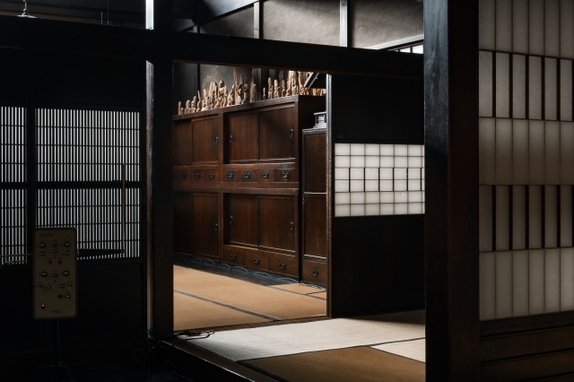 川尻治助は飛騨の大工の名門、谷口家の谷口延恭に師事し、彫刻の名手としても知られています。1879年(明治12年)に建てられた日下部家住宅では、これまで社寺建築に使われていた軒裏のセガイ*を民家に取り入れるなど、高山の近代民家建築を切り開きました。いかにも雪国の民家らしく、低く深く重々しい軒や、どっしりとした構えの中に美しい出格子が印象的です。豪快に組み上げられた吹き抜けの梁組はスケール感があり、隣り合う吉島家との対照性を感じさせます。吉島家とともに、明治以降の町家建築としては、初めて重要文化財に指定されました。