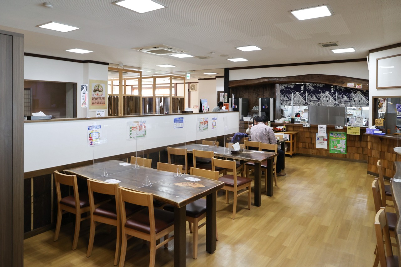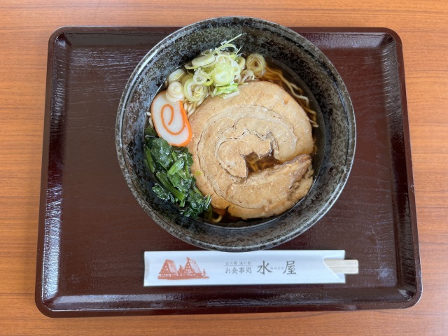 お食事処「水屋(みんじゃ)」では、白川郷ブランドの「結旨豚」を使ったメニューが一押し。「結旨豚のちゃーしゅーめん」の分厚く大きな自家製豚バラチャーシューはとろけるおいしさ。人気メニューは豚骨味噌味の「昇竜らーめん」。白川郷コシヒカリの米粉で作ったラーメンを使用しています。