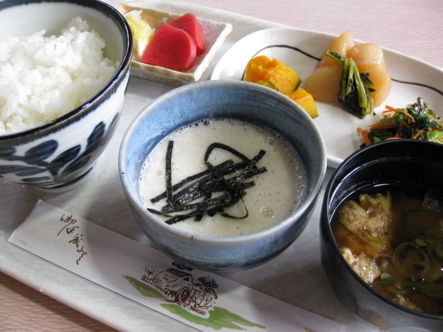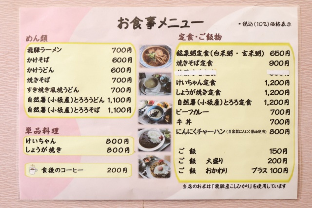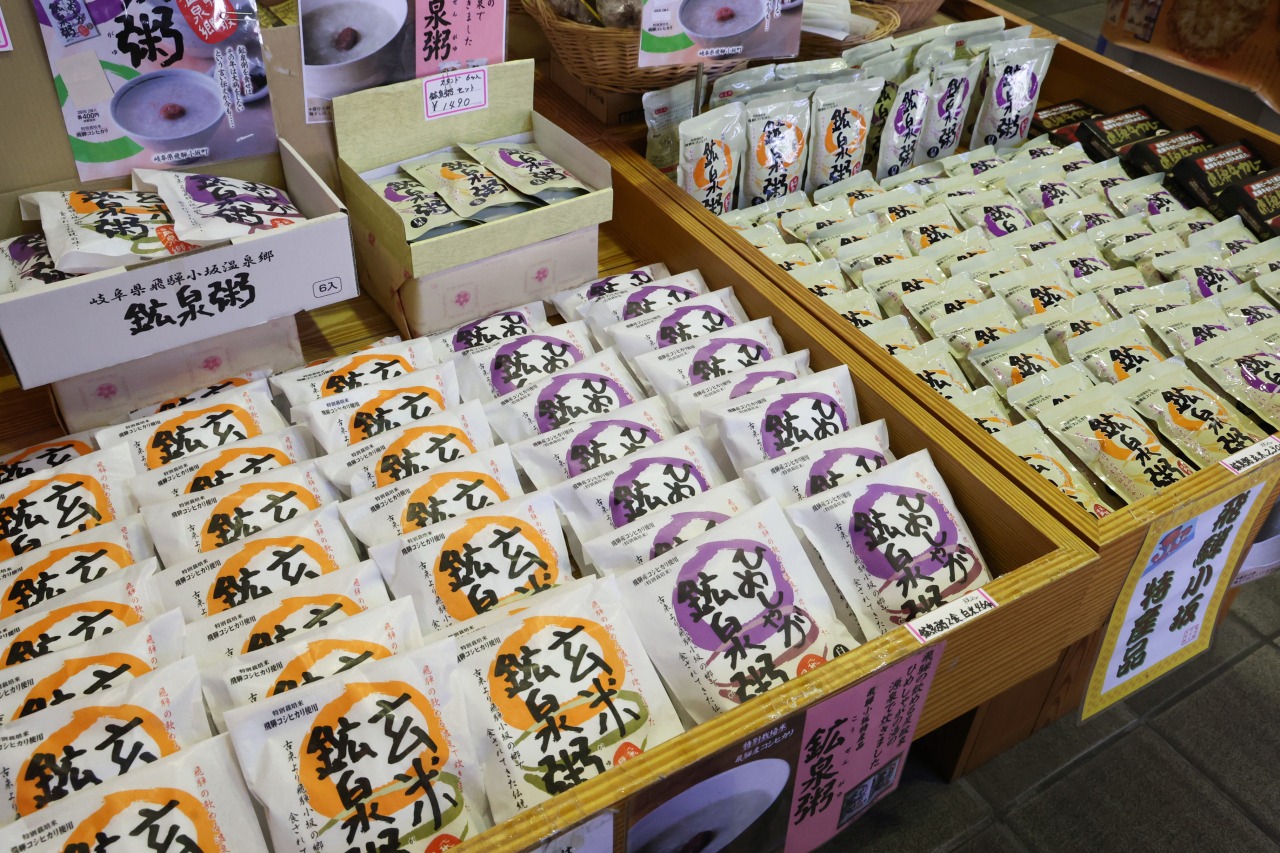 近くにある炭酸泉「ひめしゃがの湯」の源泉で炊いた「鉱泉粥」は、昔から小坂の人々が子どもの頃から胃腸の調子が悪い時に食べていた郷土食。鉱泉の味は一言で言うと「鉄と塩を混ぜたような微炭酸飲料」だそう。胃腸の弱い年配の方の中には「これがないと生きていけない」というほど。