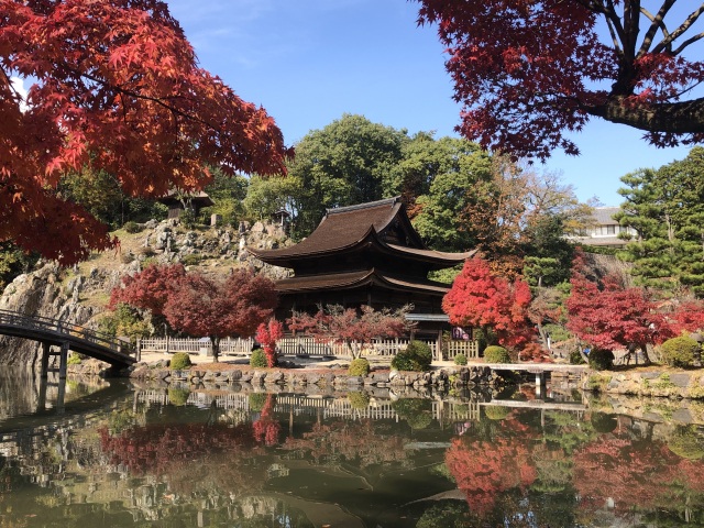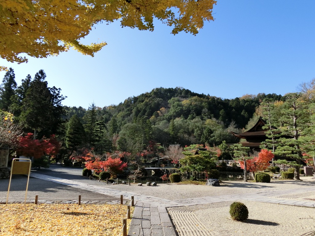 秋になると、庭園のモミジと本堂前の大イチョウが鮮やかに色づき、青く澄んだ秋晴れの空に見事に映えます。