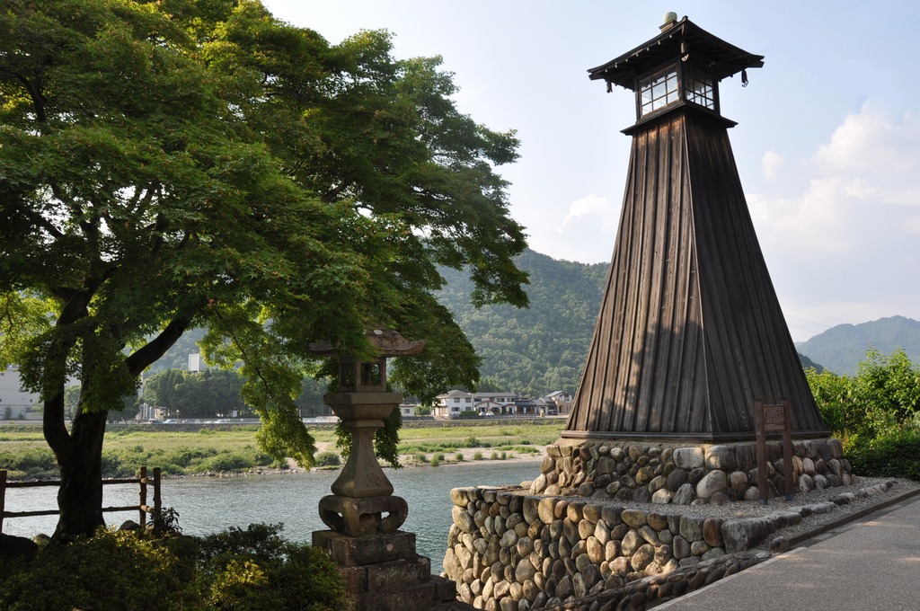 長良川畔に江戸時代の武将金森長近によって開かれた湊です。長近は関ヶ原戦の功によりこの地を加封されると、小倉山城を築き、低地にあった上有知の町を丘上に移して城下町上有知の町づくりを行いました。さらに町の繁栄策として六斎市を開かせ、物資輸送の玄関口として上有知湊を開き、番船40隻をおいて長良川下流への船搬の拠点としました。