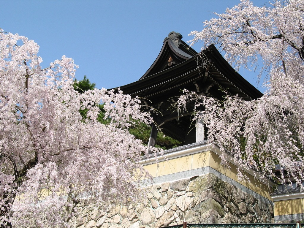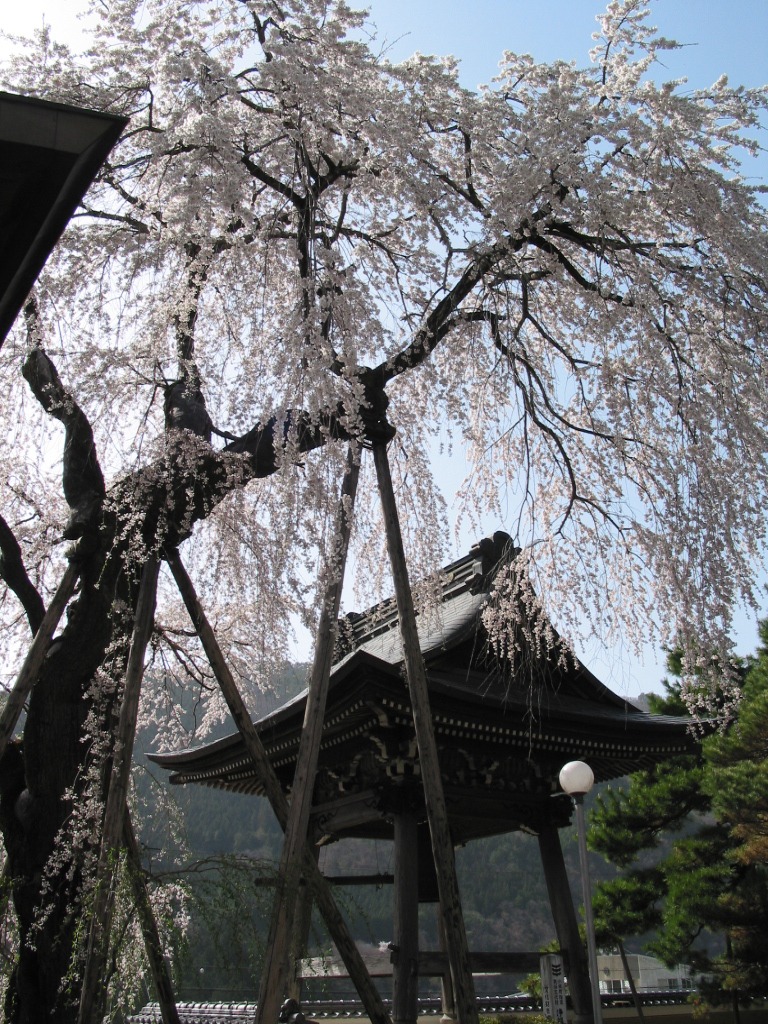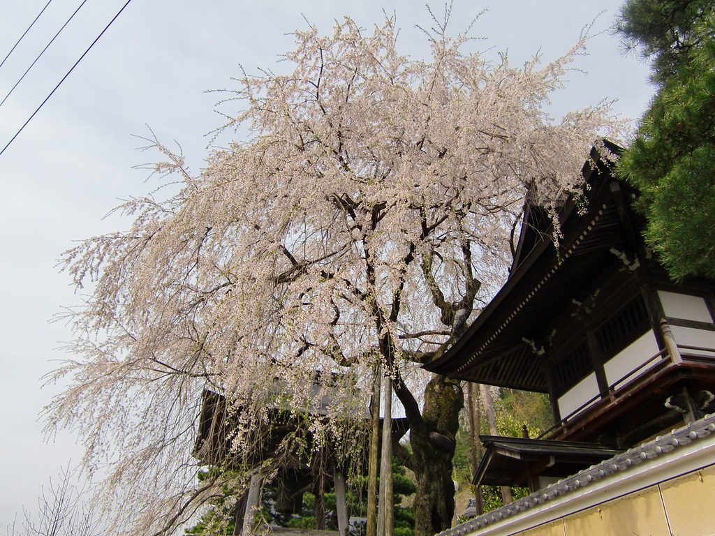 お寺の山門と鐘楼と枝垂れ桜のバランスが見事です。