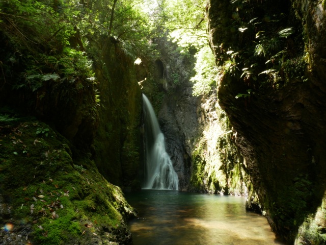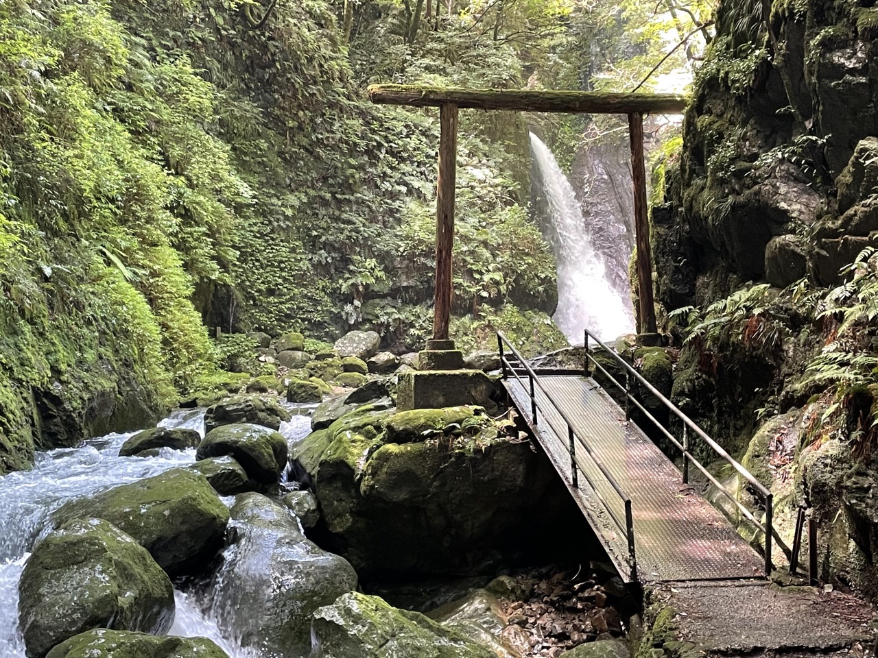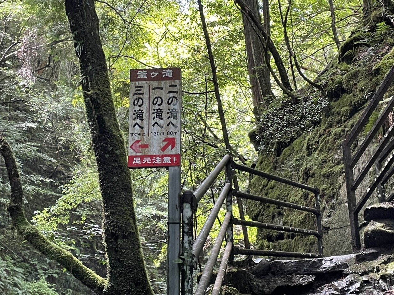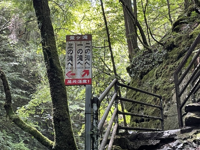 ダイナミックな三連の滝で、滝つぼが巨大な釜のように見えることから、釜ヶ滝と呼ばれています。