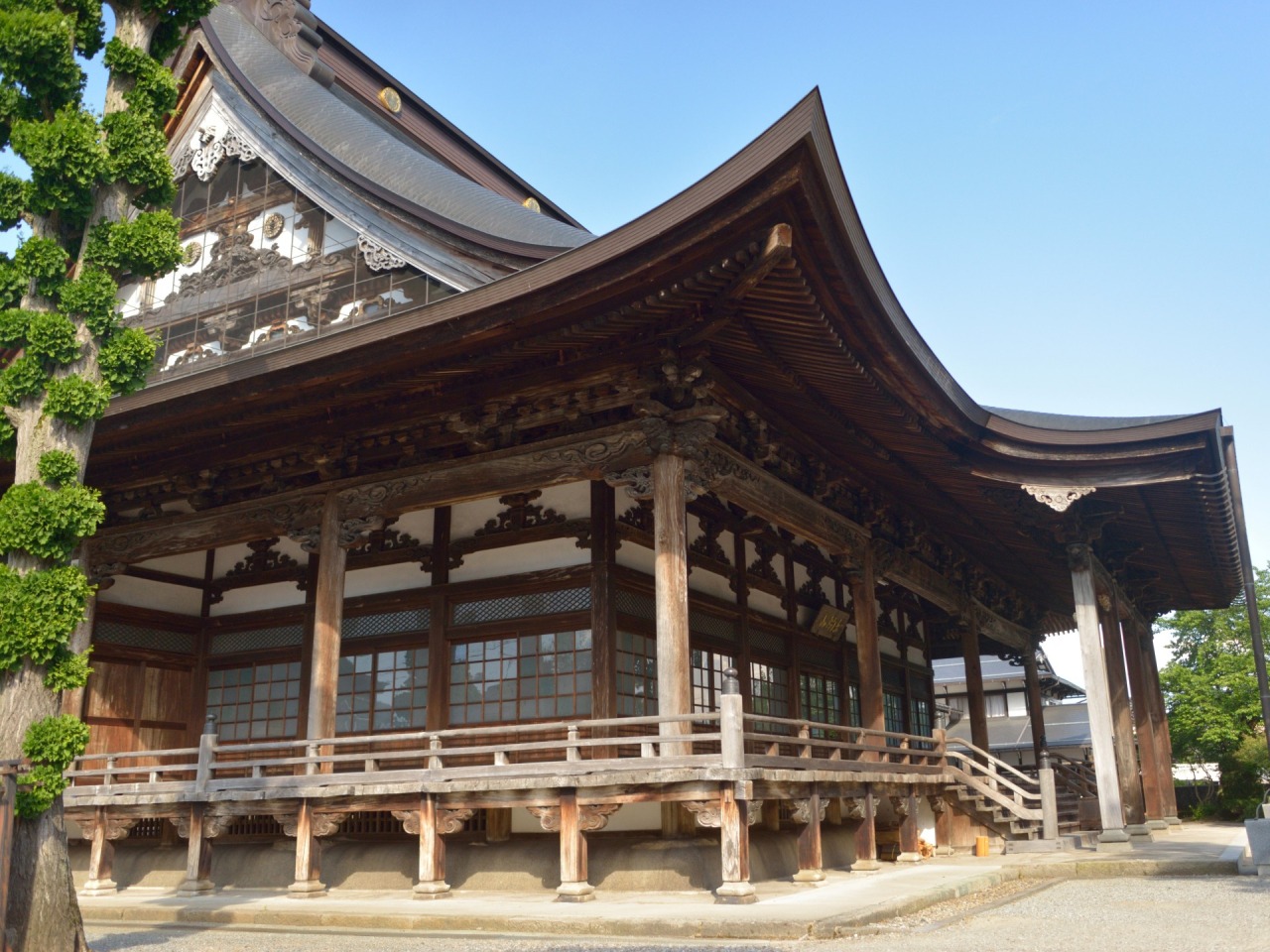 注目したいのは、本堂の屋根下の両側に施された亀の彫り物。この亀が、明治37年の古川町の市街地ををほとんどを焼失させた古川大火から、このお寺を守ってくれたといわれ、地元の人々は「水呼びの亀」と呼んでいます。