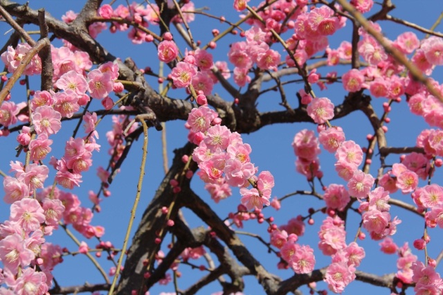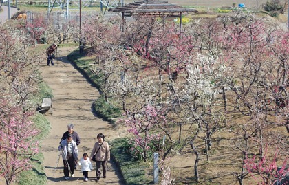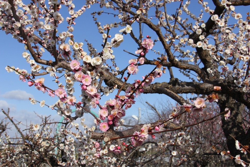 1月下旬から楽しめる早咲きの寒紅梅(かんこうばい)、月の桂(つきのかつら)に始まり、遅咲きの開運梅(かいうんばい)、淋子梅(りんしばい)などは3月下旬までと、品種により開花時期が異なるため、長い期間に渡り楽しめます。