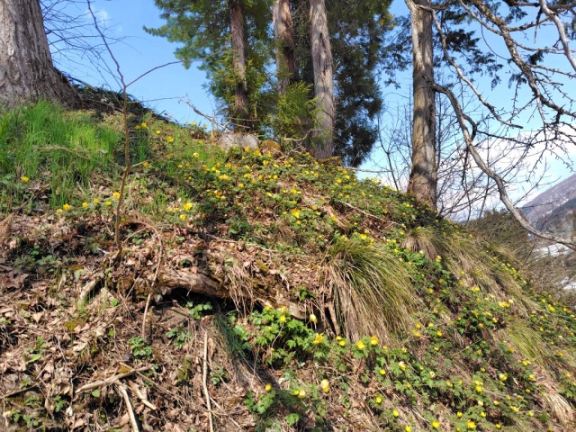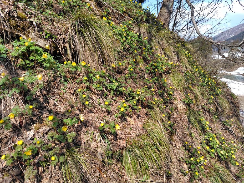 飛騨市河合町にはフクジュソウ群生地が2カ所あります。岐阜県の天然記念物に指定され、毎年美しい花を咲かせます。上ヶ島地区は、飛騨市で最も早く開花し、花も色鮮やかで美しいと言われています。日の良く当たる南向きの斜面一面に次々と咲きます。