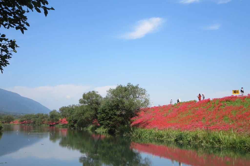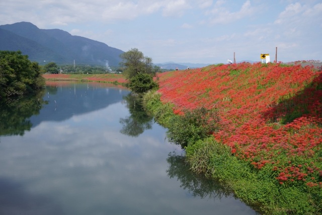 津屋川の彼岸花は、真っ赤な花とともに養老山麓や周辺の緑、青い空が川面に映り込み、リフレクション撮影スポットとして人気があります!