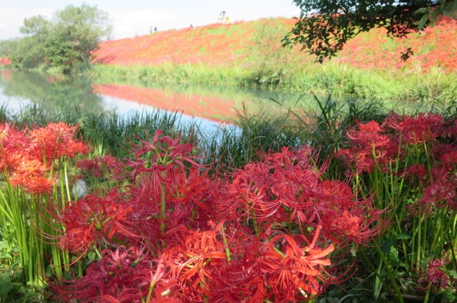 雄大な養老山麓を望み、堤防の斜面を見渡す限り赤に染めた景色は圧巻です。