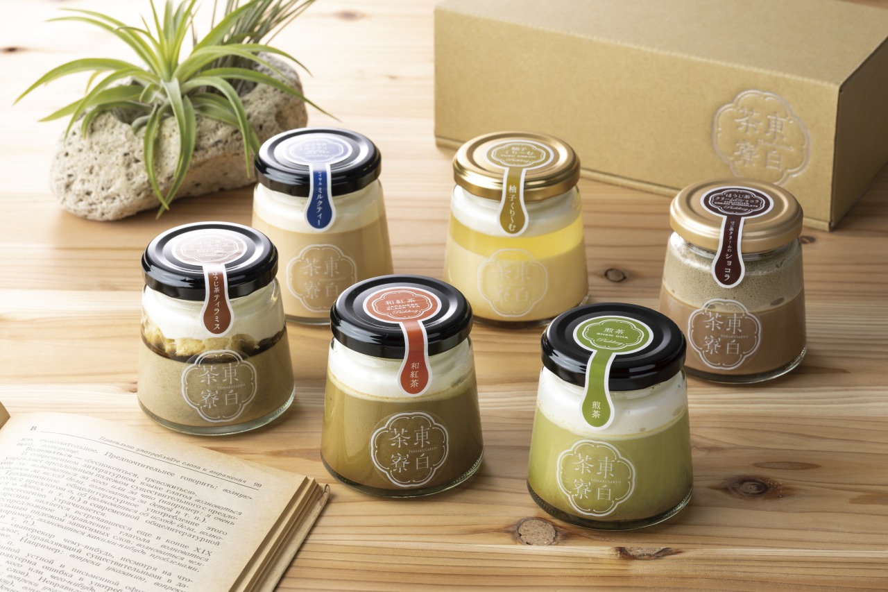 試行錯誤を経て出来上がったお茶プリン「東白茶寮(とうはくさりょう)」は、美濃白川茶をもっと多くの人に知ってもらいたいとの想いから誕生。岐阜県の「西洋菓子工房フランセヤノ」監修のレシピで、煎茶やほうじ茶などの定番に加え、和紅茶や煎茶ラテなど豊富なラインナップ。