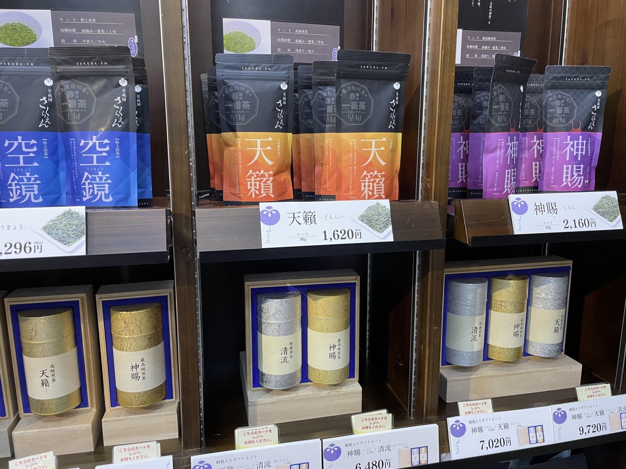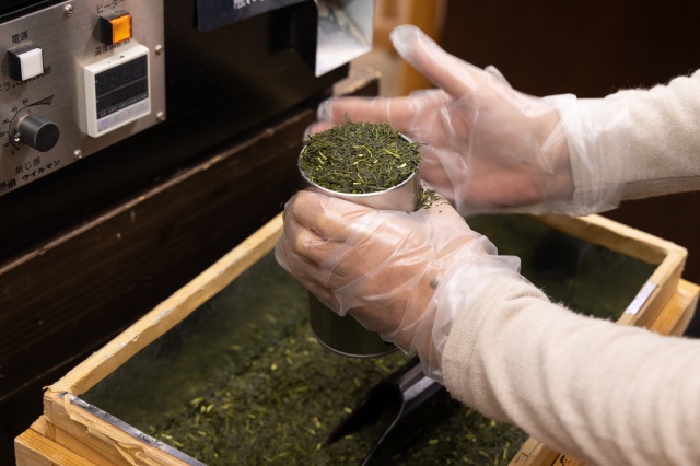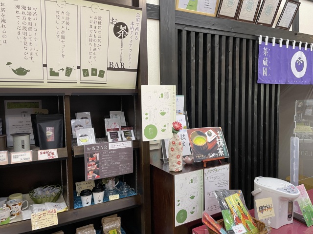 人気の「茶農家のまかない茶」コーナーからは、焙煎したてのほうじ茶の香りが。250gほどが入る袋に詰め放題にして1000円~とおトク感たっぷり。茶葉のランクは2種類から選べます。