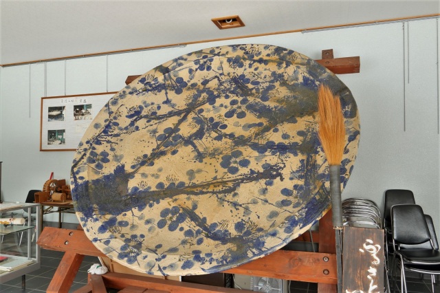 葦で作った巨大な筆で梅の花が描きあげられています。