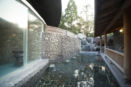 樹木の緑と巨岩に囲まれ、広がる空を天井とした野天風呂が自慢です。