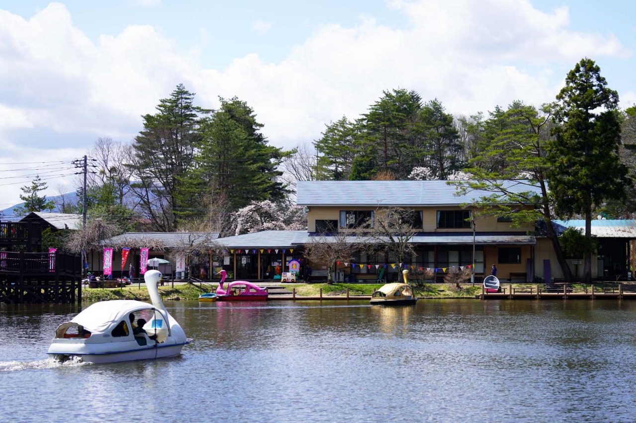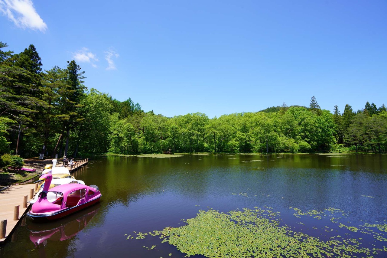 エメラルドグリーンの美女ヶ池では、釣りやボートも楽しめ、自然の中でゆったりとした時間を満喫できます。