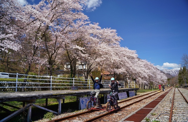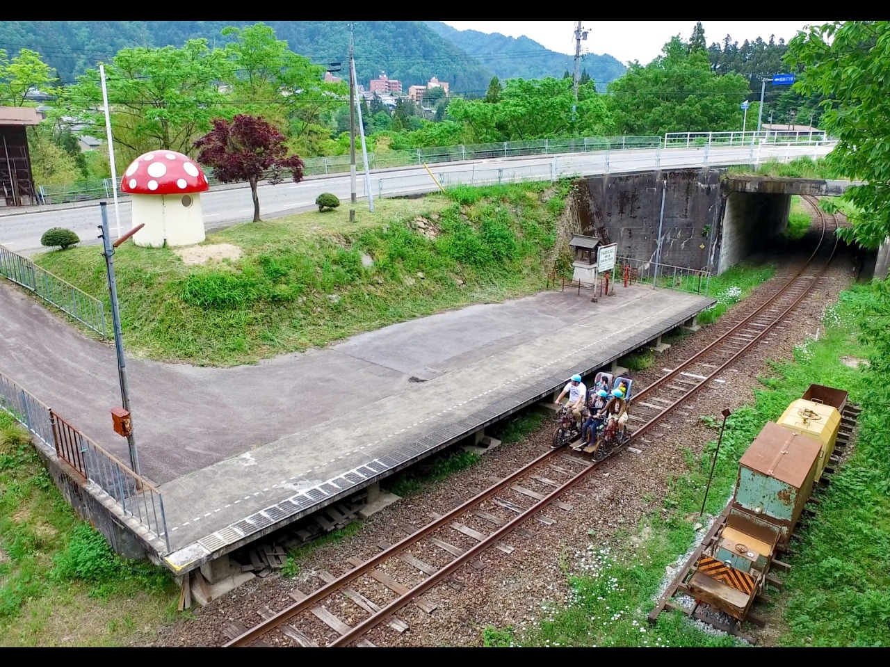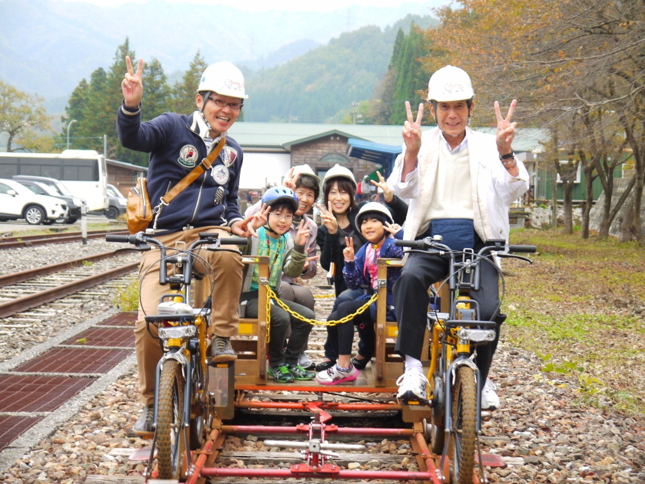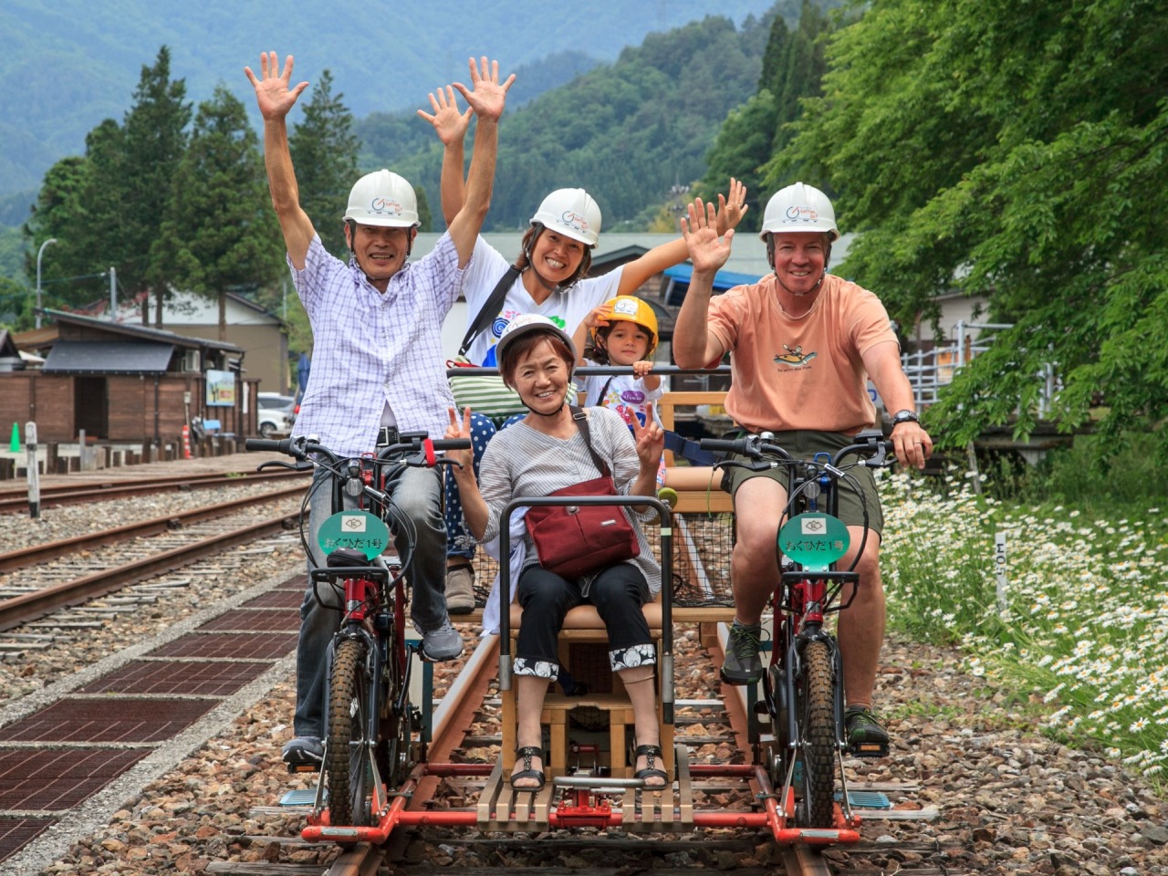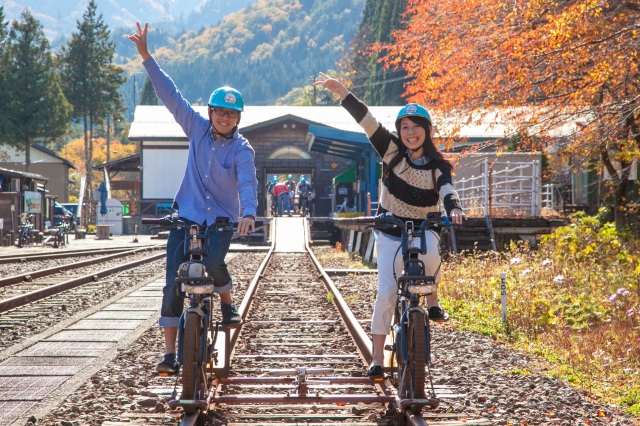 まちなかコースは、旧神岡鉄道の奥飛騨温泉口駅からスタートする、神岡市街地を眺めながら走るコース。昭和レトロな街並みを見ながら楽しむことができます。様々なタイプの車両が用意されていますので、ファミリーやグループにオススメ!車いすの方や赤ちゃん、ペットまで楽しむことができます。