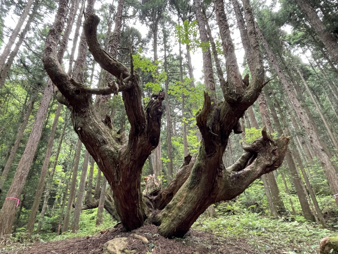 1本の根元から何本も幹が立ち上がる、全国的にも珍しい樹形の杉が50株ほど群生し、訪れる人を圧倒します。