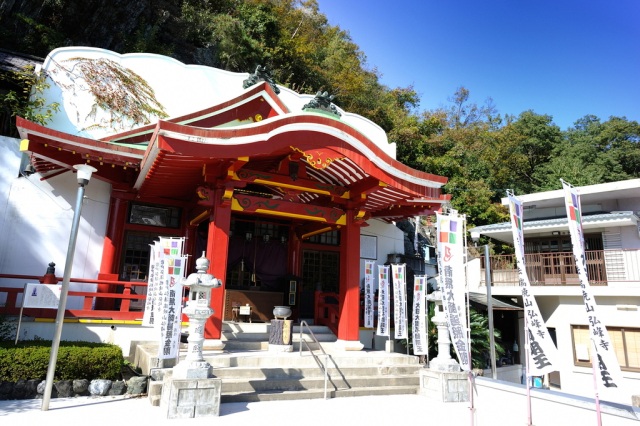 金華山のふもとに位置する日本最大級の岩窟本堂を誇る、高野山真言宗のお寺です。