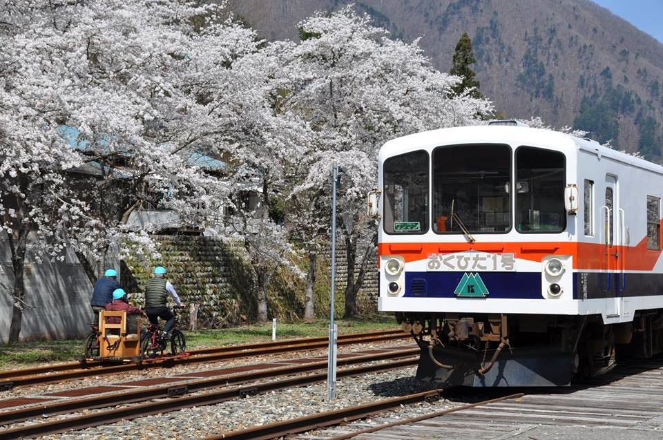旧神岡鉄道の廃線跡を利用した新感覚のアクティビティー「レールマウンテンバイクGattan Go!!(ガッタンゴー)」。
