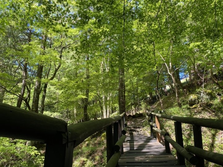 付知峡遊歩道約860mを歩くと、岩肌を流れる『観音滝』、水量が多くダイナミックに流れる『不動滝』を見ながら、マイナスイオンをいっぱい吸って、自然を満喫してください。