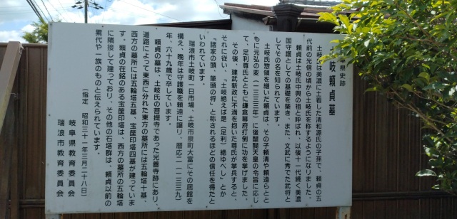土岐頼貞の墓(ときよりさだのはか) 南北朝時代に美濃国守護となった土岐頼貞とその一族の墓です。この辺りは、江戸時代には中島村と呼ばれ興禅寺(光善寺)跡とも言われています。墓所は道路によって東西に分断され、東側は五輪塔10基、西側には五輪塔5基と宝篋印塔4基があります。頼貞の墓には「暦二年巳卯二月二十二日亥刻逝去」(1339)の文字が刻まれています。この墓所は、どれも立派で当時の土岐氏の勢力を偲ばせ、これだけの墓塔が一か所に建てられるのは珍しく、県指定文化財になっています。 エリア 東濃 瑞浪市 カテゴリー 歴史を知る 戦国・城郭 Loading... フォトツアーを見る 基本情報 住所 岐阜県瑞浪市岐阜県土岐町6683 アクセス 電車:JR中央線瑞浪駅徒歩10分 自動車:中央自動車道瑞浪ICから10分
