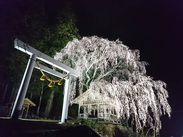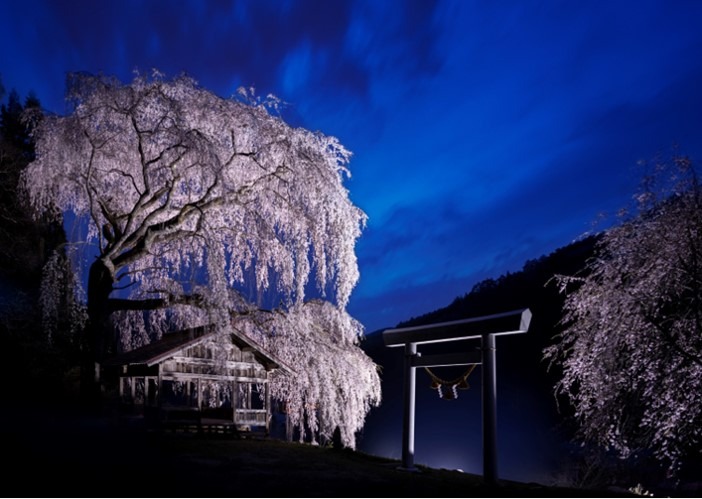 高山市の水田に映る枝垂れ桜、春の桜ライトアップといえば青屋神明神社の枝垂れ桜。朝日町は「枝垂れ桜の里」とも呼ばれ、4月後半に道の駅ひだ朝日村から数分の距離で、様々の寺や神社に素晴らしい枝垂桜がご覧いただけます。