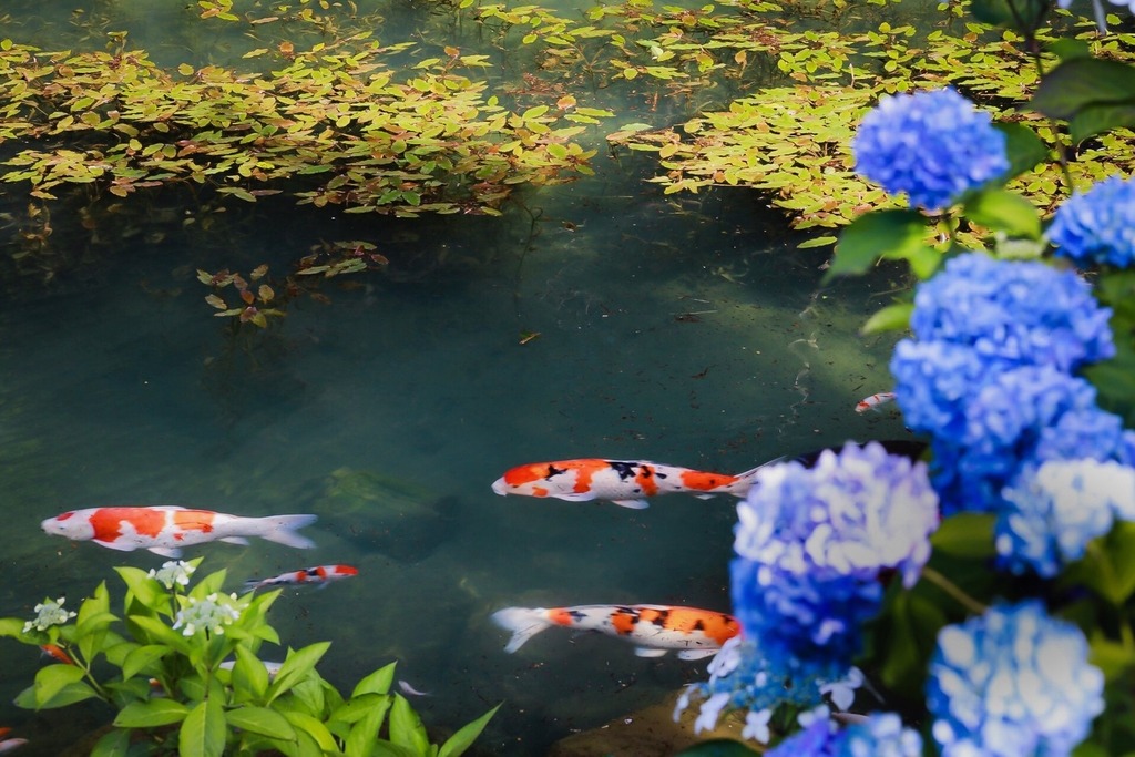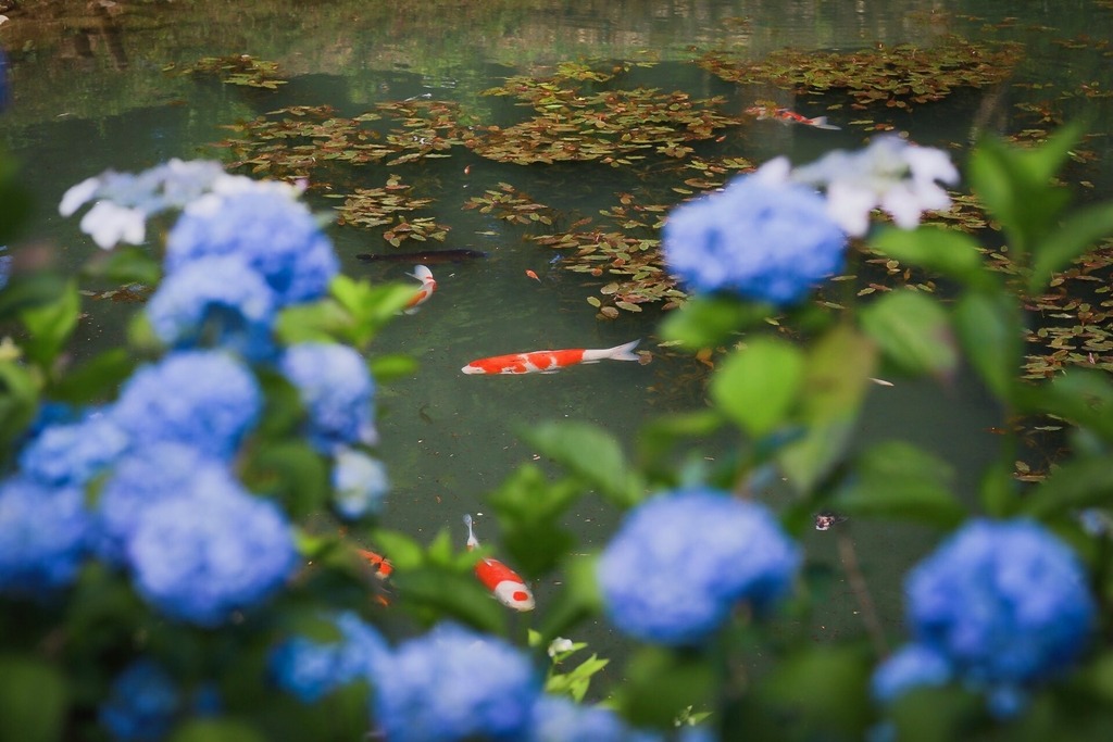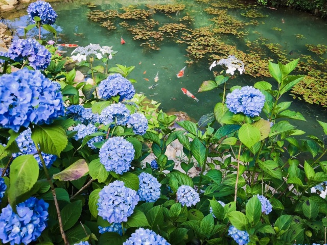 また境内のあじさい越しに見る池では、水の中を優雅に泳ぐ鯉とあじさいでとても癒され、何分でも、何時間でも眺めていられます。