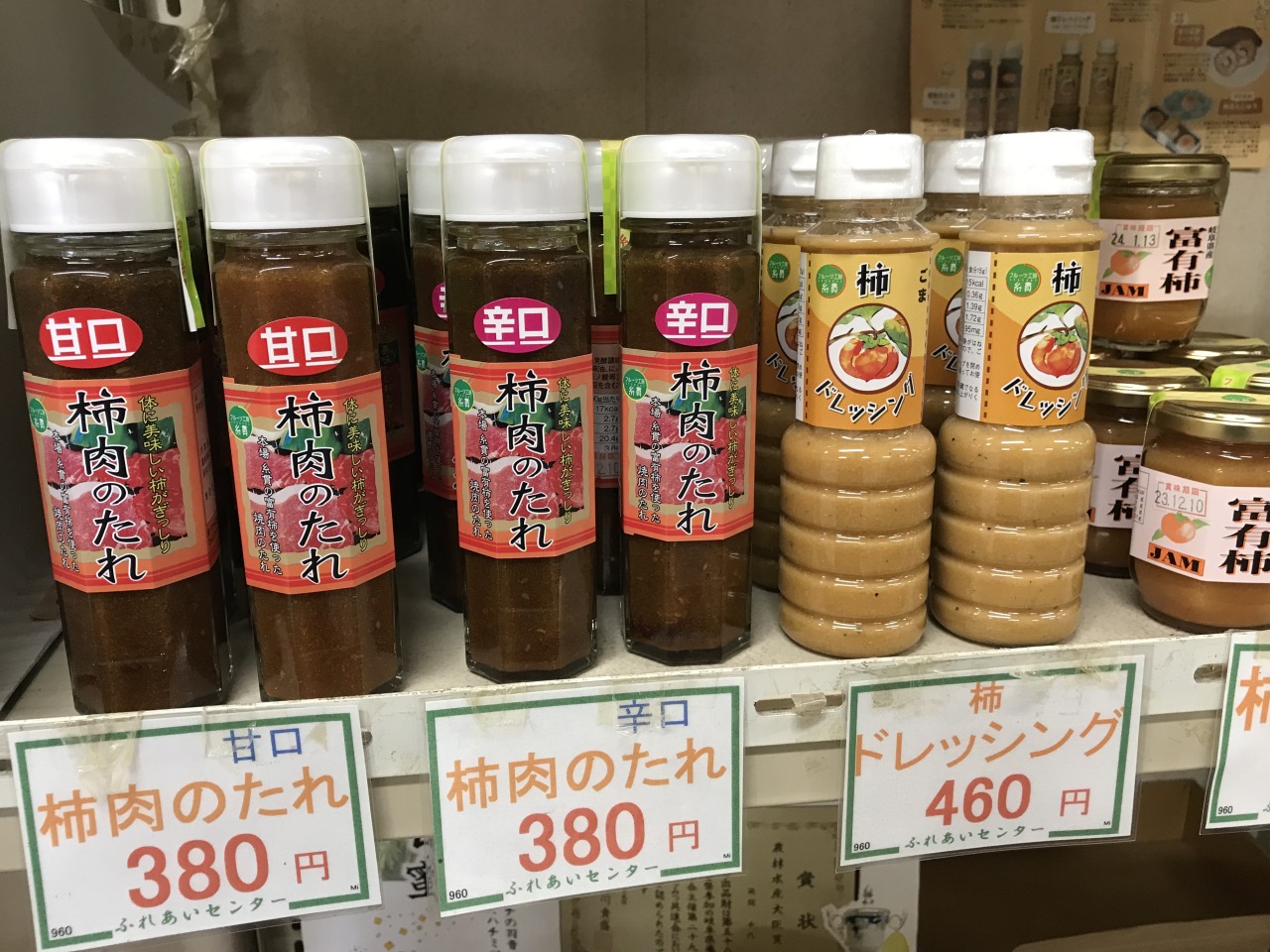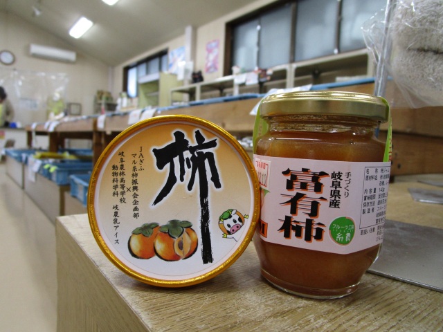 柿を使った加工品も豊富。「柿アイス」は岐阜農林高校とマル糸柿振興会コラボして作ったもので、富有柿の果肉を40%使用している。口の中で富有柿の味と香りが広がり、なめらかな舌触り。「柿ジャム」は糸貫地区の女性グループが、大粒で甘みの強い富有柿を贅沢に使用して製造しています。焼肉のたれならぬ、「柿肉のたれ」を販売。柿を使った甘辛味のたれで、焼肉以外にもさまざまな料理に使用するのがおすすめです。