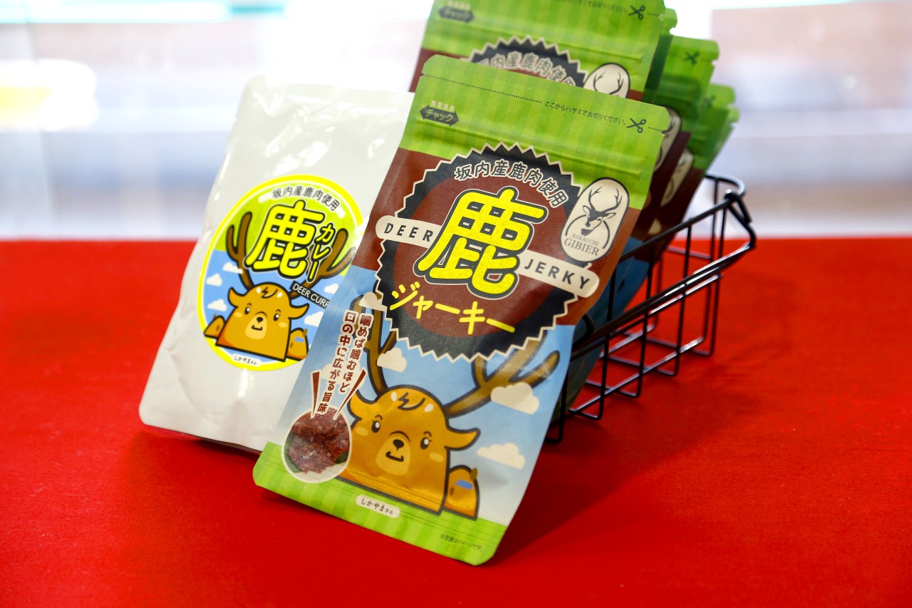 一番の推し商品はジビエ(鹿)。地元の猟師が捕獲した鹿を近隣の解体・加工施設へと運び、さまざまな商品に加工して販売しています。捕獲から解体までの時間がスピーディーなため、臭みやクセが抑えられ、食べやすいと評判。言われるまで鹿肉だとわからないほどだそう。冷凍保存しているため、1年中食べられます。