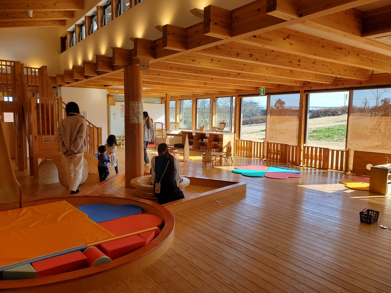 県産材を使った大型遊具(すべり台やたまごプール等)で大野町らしさ(古墳、バラ、柿)を表現したり、木のおもちゃもふんだんに取り入れられた子育て支援施設です。図書ルームや乳児室も備え、子育て親子の交流の場を提供したり、子育て等に関する相談や援助を実施します。