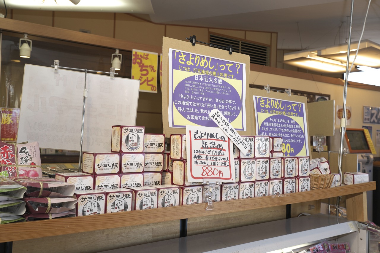 店内には「子どもにも喜んでもらいたい」とガチャを設置。200円の「青果ガチャ」、500円の「大人ガチャ」があり、1等から6等まであり、「どれが当たってもオトク」と老若男女から大人気です。また、「平芋」「でかま芋」「金の俵」など、他では聞いたことのない青果物が所狭しと並びます。東濃実業高校の生徒が開発に携わった「サヨリ飯」は、可児ならではのおみやげ。可児では昔、細長い魚を全て「さより」と呼んでいたそうで、サヨリ飯の実情はサンマごはん。缶詰になっているため、保存性も高い。