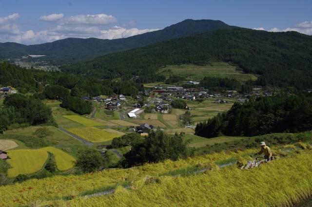 中野方町坂折地区の棚田は、今から400年ほど前から築かれ始め、明治時代初期にはほぼ現在の形を形成。全国でも有数の美しい景色が評価され、1999(平成11)年には農林水産省の日本の棚田百選に認定されました。急傾斜での水田のほどんどを、一つ一つの石で積んである石積みのあぜが特徴です。