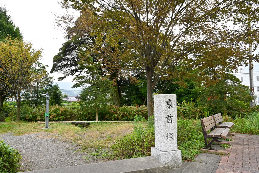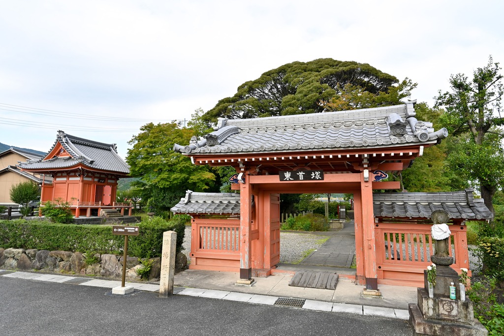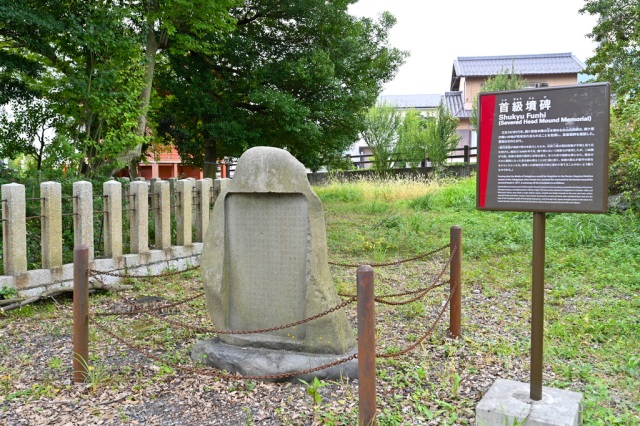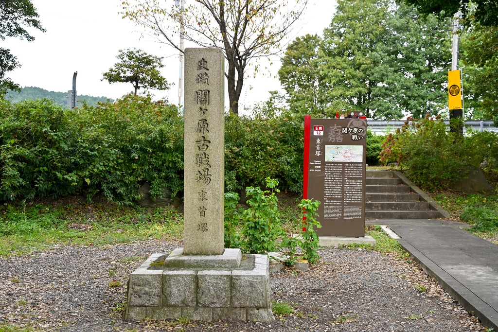 JR関ケ原駅のすぐ西の跨線橋を渡ると、左手に広葉樹の森がありその中に「東首塚」があります。朱色の大きな門を抜けると、その奥にスダジイの大木が茂った塚があります。この塚は関ケ原合戦後、徳川家康が床几場で首実検をし、その後東西2ヶ所に埋葬したことから「東首塚」と呼ばれているのです。この首塚に、当時この地の領主であった竹中重門が、家康の命により関ケ原の戦いで戦死した兵士たちを埋葬しました。この首塚に埋められている戦死者の数は定かではありません。しかし、西軍・東軍、計15万人の兵がぶつかったといわれる関ケ原の戦いの規模を考えると非常に多くの戦死者が眠っているものと考えられます。