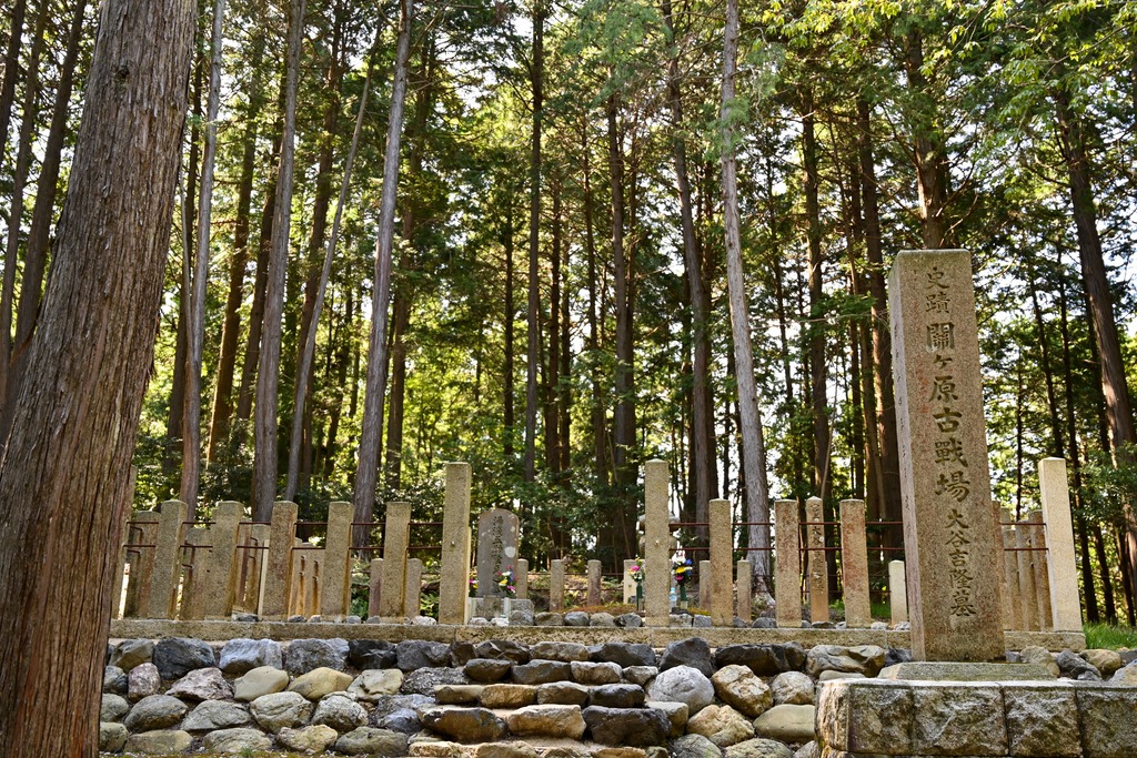 石田三成の盟友だった大谷吉継は、病身を押して関ケ原の合戦に参戦し、三成への『義』を貫きます。吉継は藤堂・京極隊や裏切った小早川隊などと激戦を繰り広げましたが、次々と味方の武将も討ち死にし、もはやこれまでと自刃しました。吉継の首は、五助の手によりその地に埋め隠されました。五助はその後討ち入りますが、藤堂仁右衛門に捕らわれました。その時、五助は主人の首の在処を藤堂に正直に伝えて供養を頼んだ上で討たれました。敵ながらに感心した藤堂は、家康からの詰問にも決して吉継の首の所在を口外せず、合戦後、約束通り「大谷吉継の墓」をこの地に建てたとされています。