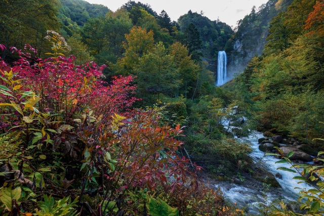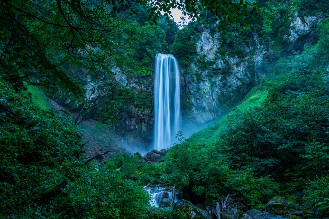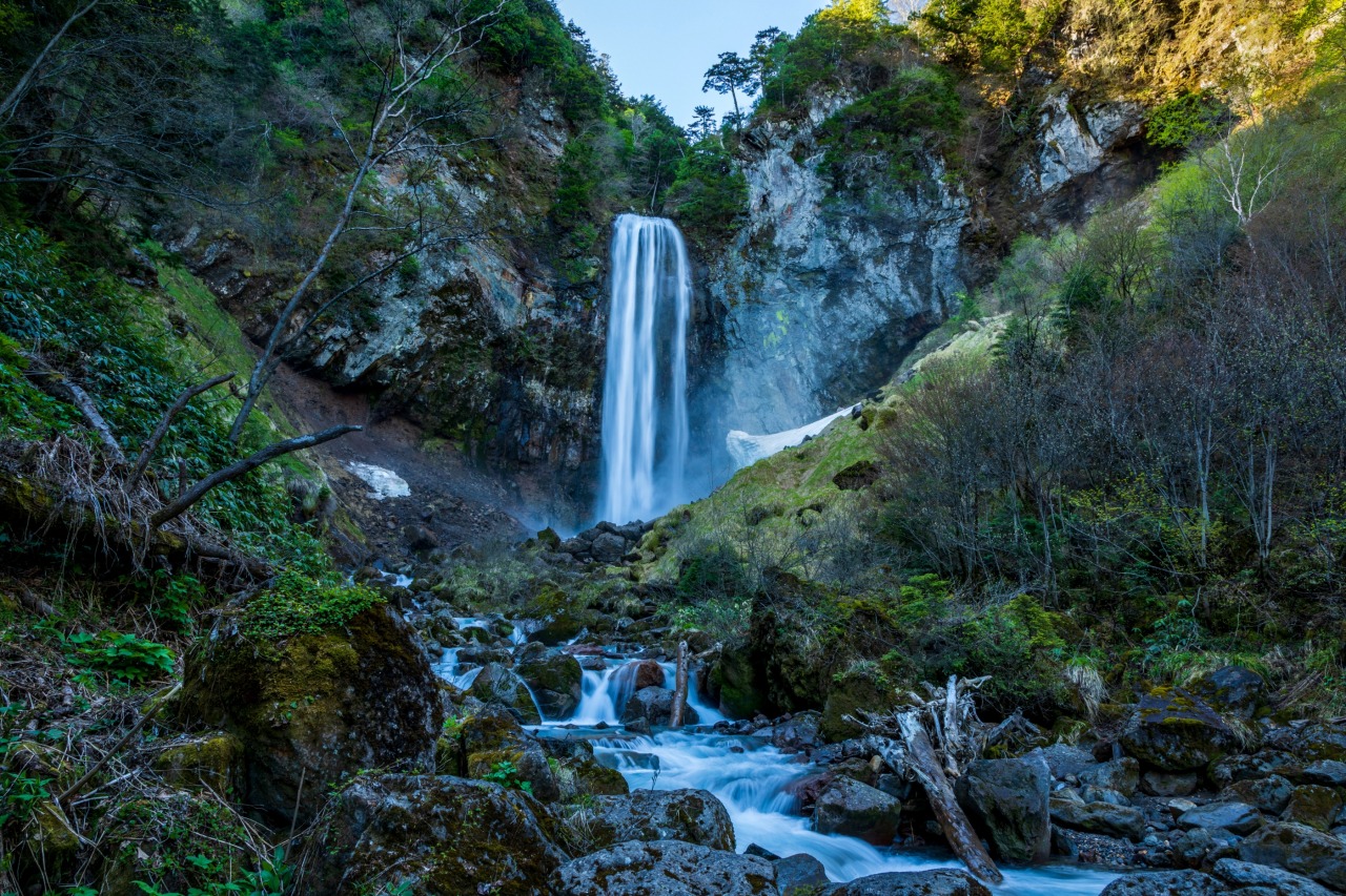 落差64メートル、幅6メートルの平湯大滝。飛騨三大名瀑のひとつで、日本の滝百選・岐阜の名水50選にも選ばれています。5月上旬、まだ雪が残る滝つぼに豪快に水が流れ落ち、5月下旬には鮮やかな新緑が大滝を囲みます。10月上旬からは紅葉が始まりカエデの赤、ブナ・シラカバの黄色などあたり一帯が色鮮やかに染まります。毎年2月には、滝の結氷した姿をライトアップする「平湯大滝結氷まつり」を開催します。